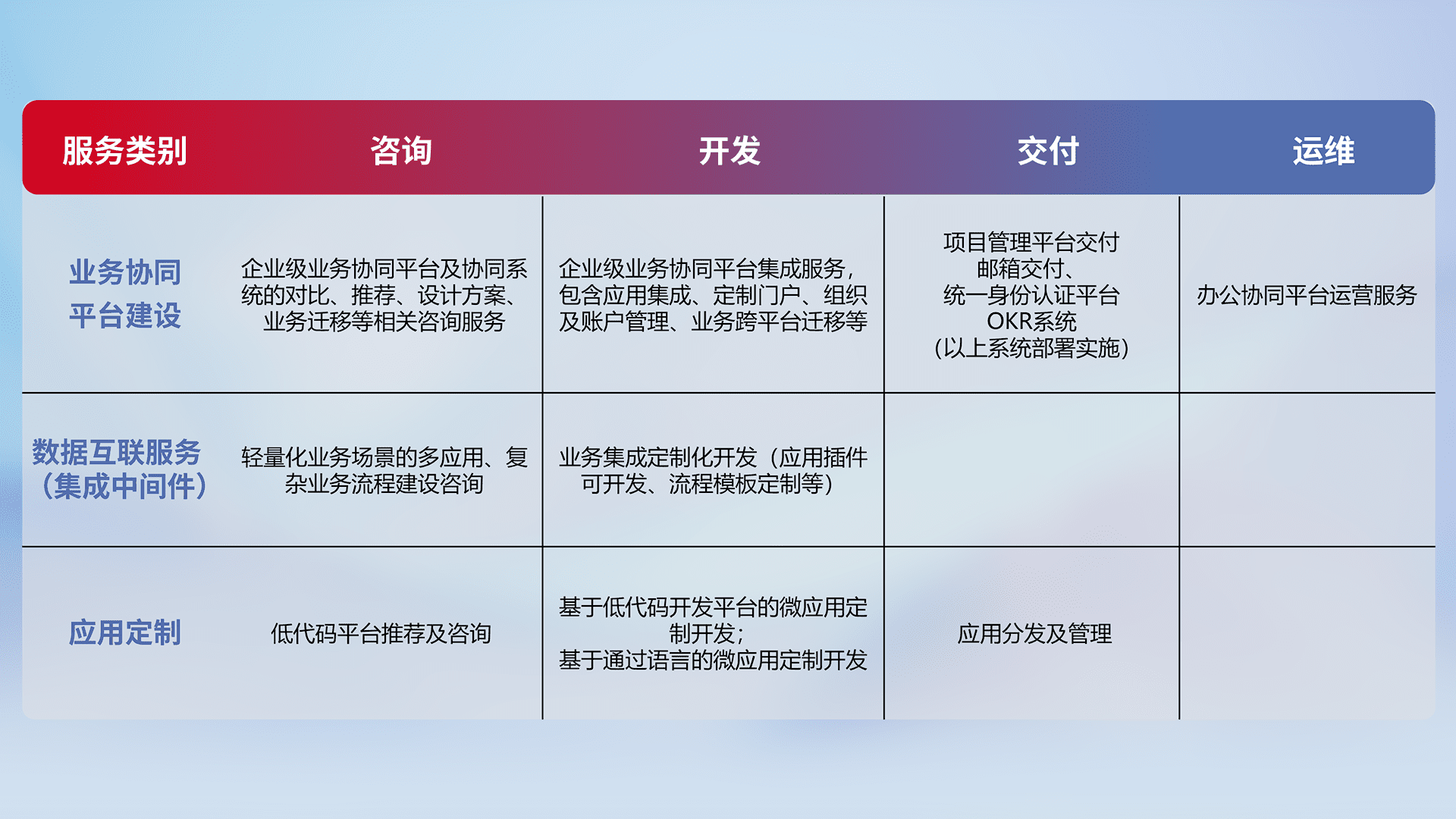 针对钉钉、、、企微、、、IDaas等平台级产品提供产品的规划、、、方案、、交付、、、、定制化开发等服务,,,实现如统一协同办公、、、、智能客户服务、、、、混合会议管理、、智能数据查询、、等业务场景,,,实现数字化转型。。